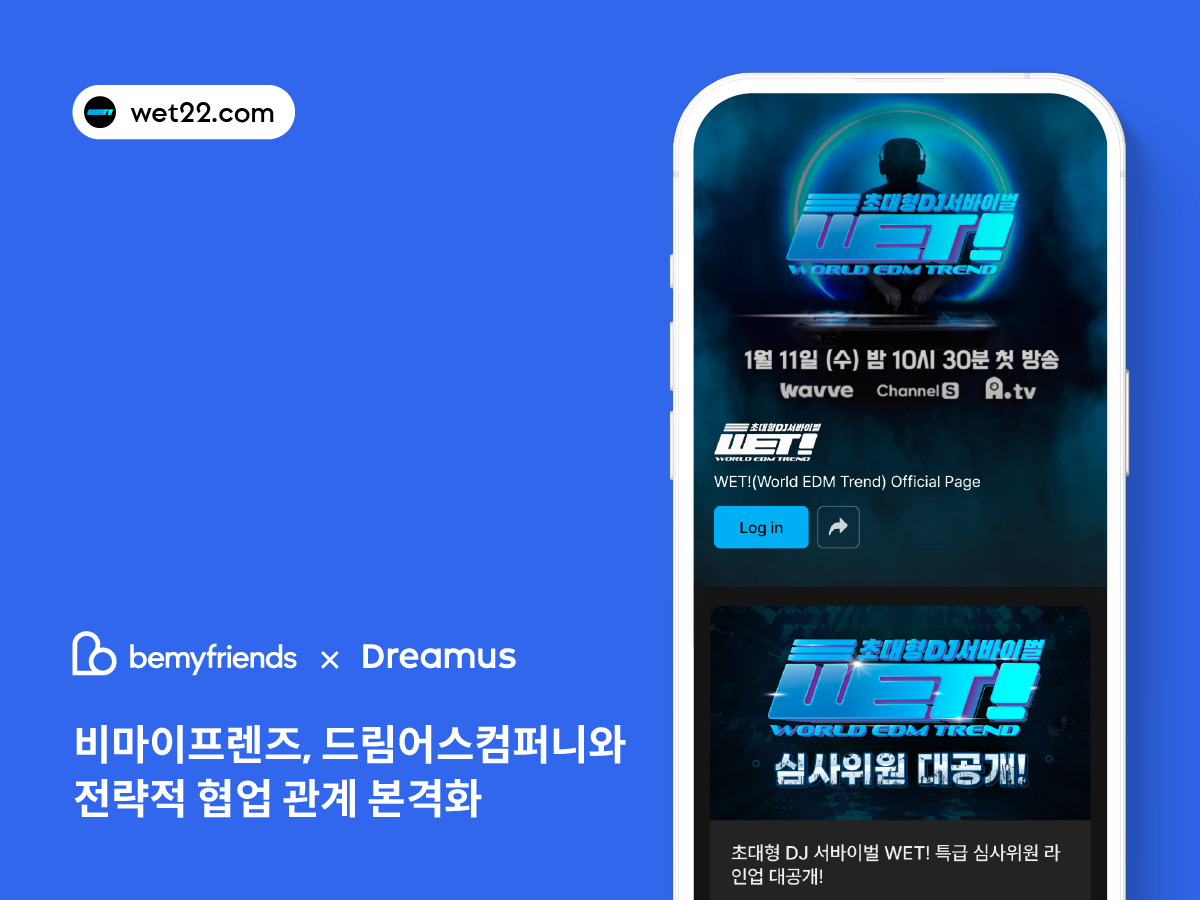 2023년 1월 16일 - 글로벌 팬덤 비즈니스 전문 기업 ‘비마이프렌즈’가 드림어스컴퍼니의 자체 제작 웹 예능 ‘WET!(World EDM Trend, 이하 WET!)’의 공식 비스테이지 오픈을 지원하고 양사의 팬덤 비즈니스 강화를 위한 비즈니스 협업을 본격적으로 진행한다.