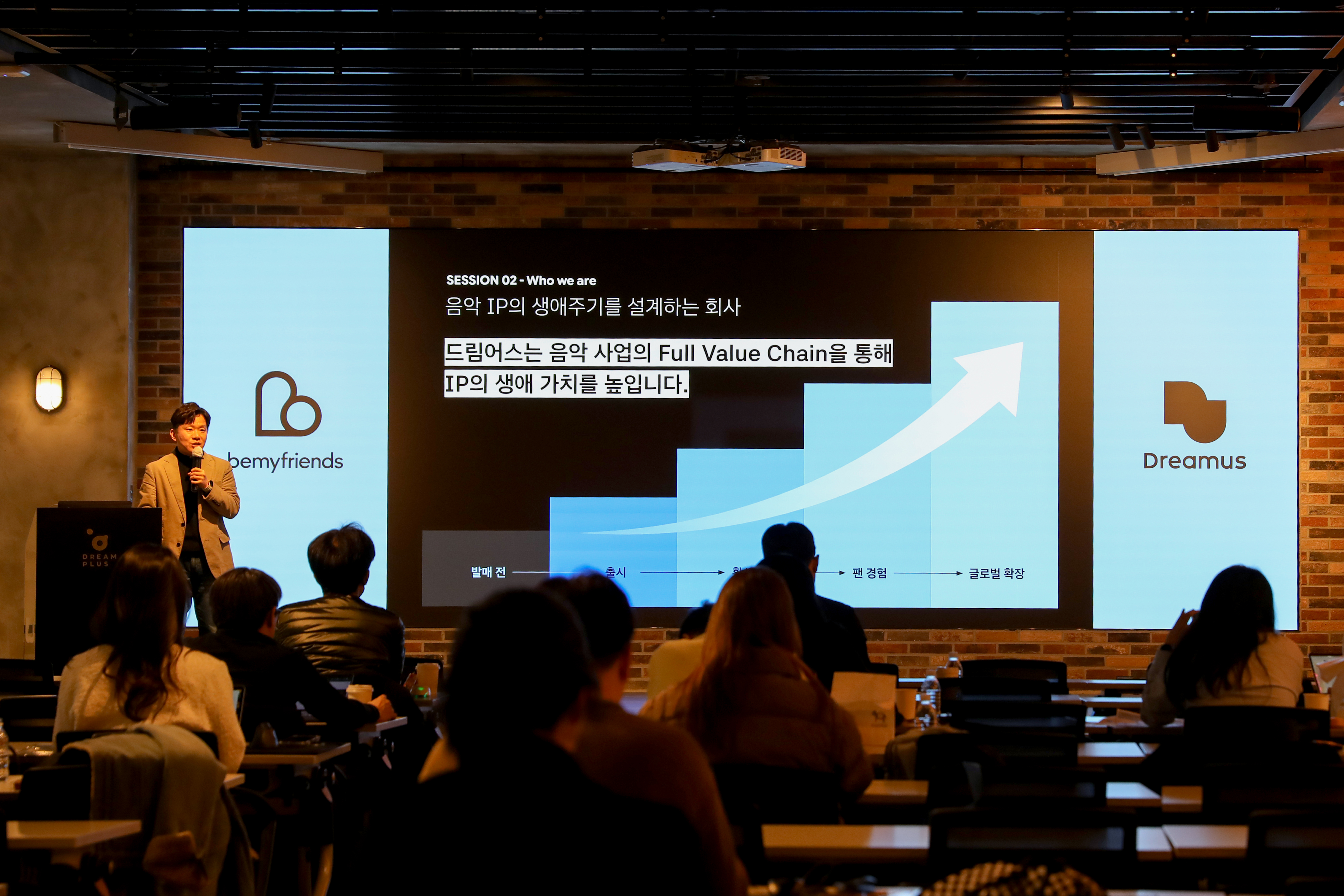 Dreamus Company CEO Kiyoung Lee then presented the company's "Music IP Lifecycle Partner" strategy — designed to ensure that music IP does not end as a one-time hit but continues to grow over time. He outlined a new growth model for increasing the lifetime value of IP through a full music IP value chain that spans release, streaming, fandom development, commerce, live performances tour, and global expansion.