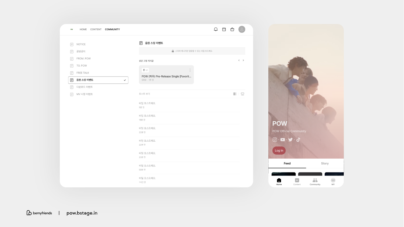 POW, a five-member rookie boy group, has been engaging with their international fandom even before dropping their pre-debut single "Favorite," via their official fan community (pow.bstage.in) on b.stage. Within this community, POW has shared teaser and greeting videos for each member, and the members have been contributing Star Stories, generating buzz and enthusiastic responses from global fans. They also plan to ramp up global fan interaction through music streaming events, music download events, and music video viewing events, ensuring a steady and interactive journey for fans worldwide.