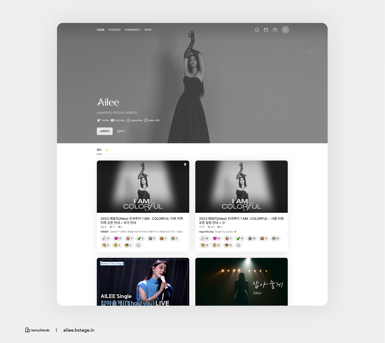 The singer Ailee has launched her new official website (ailee.bstage.in), powered by b.stage, gearing up for her 2023 National Tour, "I AM : COLORFUL." Via her website, she has shared a wide range of content and updates related to the concert, including the schedule for the national tour ticket releases, while hosting various events. Additionally, after a hiatus of a year and a half, she unveiled the music video for her latest song, "I'll Hold You," alongside videos for her hit singles like "Show Me," "Don’t Teach Me," and "Evening Sky," all of which have garnered considerable fan interest.